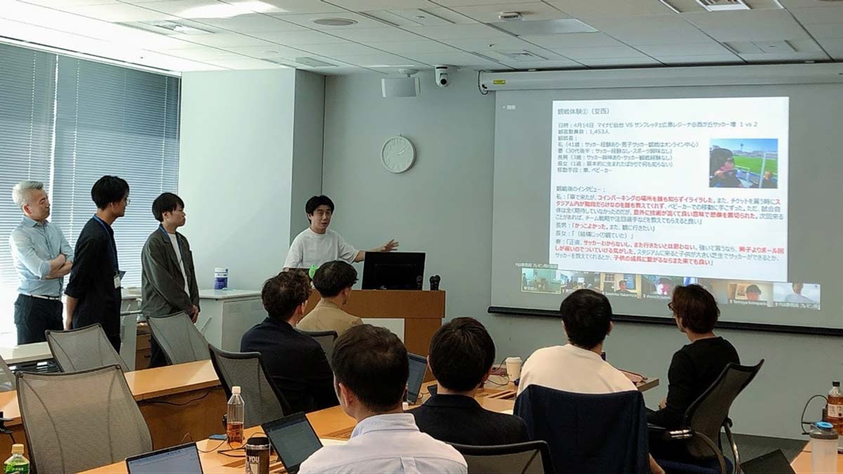 5月11日(土)は第4期生にとって初の「実践」となり、4グループに分かれてプレゼンテーションを行いました。ラグビーや競馬、WEリーグ等を現地で観戦した体験を元に、なぜ楽しいと感じたのか、もっと楽しくなるためには何が必要なのかを議論し、言語化することで理解を深めました。主催者側として様々な施策を検討するためには、そのクラブや競技が持つ強みや魅力が何なのかを、深く考えることが必要であることを共有しました。